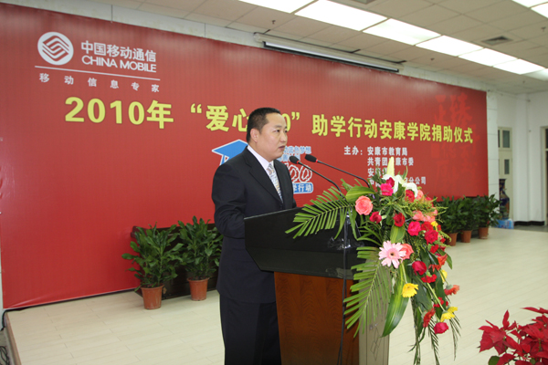 10月18日下午,“凝聚希望 放飞梦想”中国移动陕西公司安康分公司“爱心100”助学行动捐助仪式在我院图书馆六楼报告厅隆重举行。 安康市人大常委会副主任马孝芳,安康市教育局局长马恒昌,共青团安康市委副书记付波,中国移动安康分公司党委书记、总经理王保,我院党委书记杨涛、党委副书记胡鸿晓、学院相关部门负责人及部分师生参加了仪式。 王保总经理、杨涛书记和马孝芳副主任先后在仪式上讲话。我院经济与管理系2010级新生杜强代表受助学生发言。