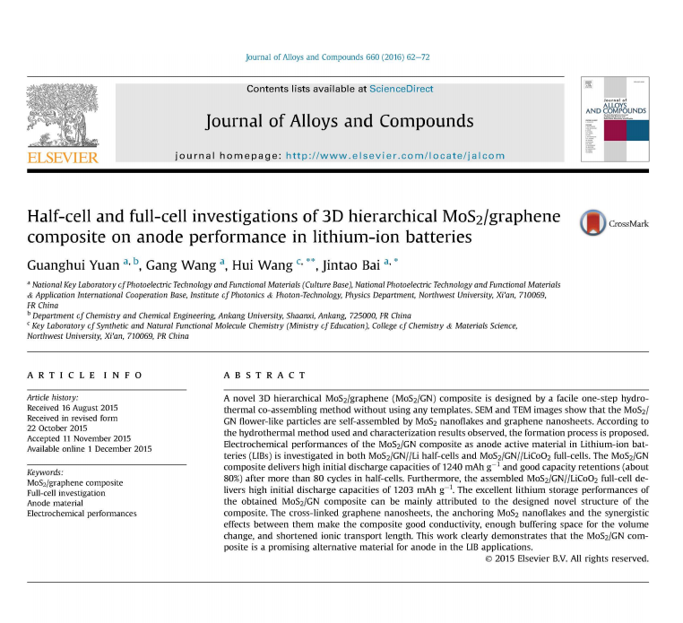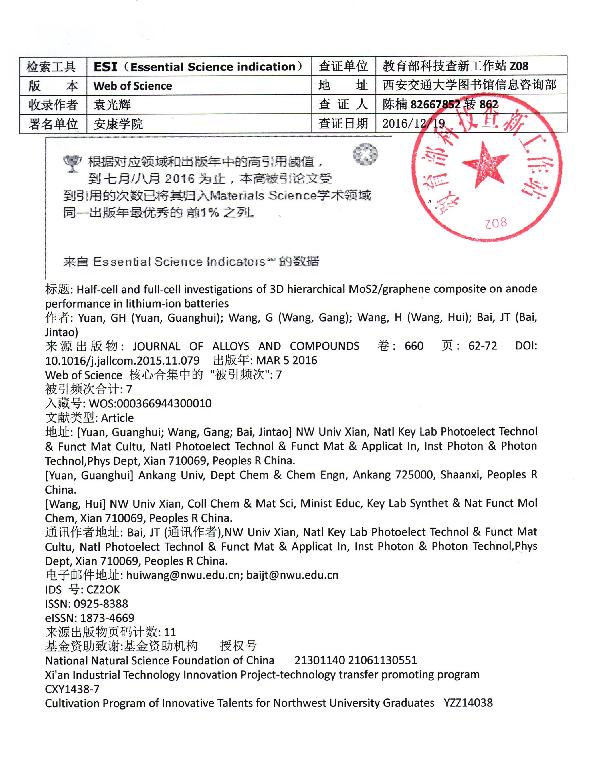 根据教育部科技查新工作站的检索证明,yl23455化学化工学院教师袁光辉以第一作者发表的论文《Half-cell and full-cell investigations of 3D hierarchical MoS2/graphene composite on anode performance in lithium-ion batteries》被Essential Science Indicators(ESI)归入材料科学领域同一出版年最优秀的前1%之列。这是yl23455迄今为止第一篇进入ESI的科技论文,也标志着yl23455材料科学研究水平达到了一个新的高度。