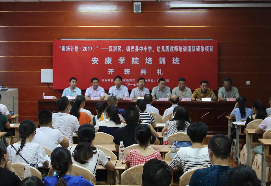 8月18日上午,由省教育厅主办、yl23455承办的“国培计划(2017)”——陕西省(汉滨区、镇巴县)中小学、幼儿园教师培训团队研修项目yl23455永利集团官网培训班开班典礼在yl234551018教室隆重举行。学校副校长钟生海、汉中市镇巴县教育局副局长王传兴、镇巴县教研室主任王大兴、安康市汉滨区教育局副局长李成清、汉滨区教师进修学校校长李本琳、两项目区县及白河县(结对帮扶县)参训学员百余人参加了开班典礼。开班典礼由继续教育学院院长谯延富主持。