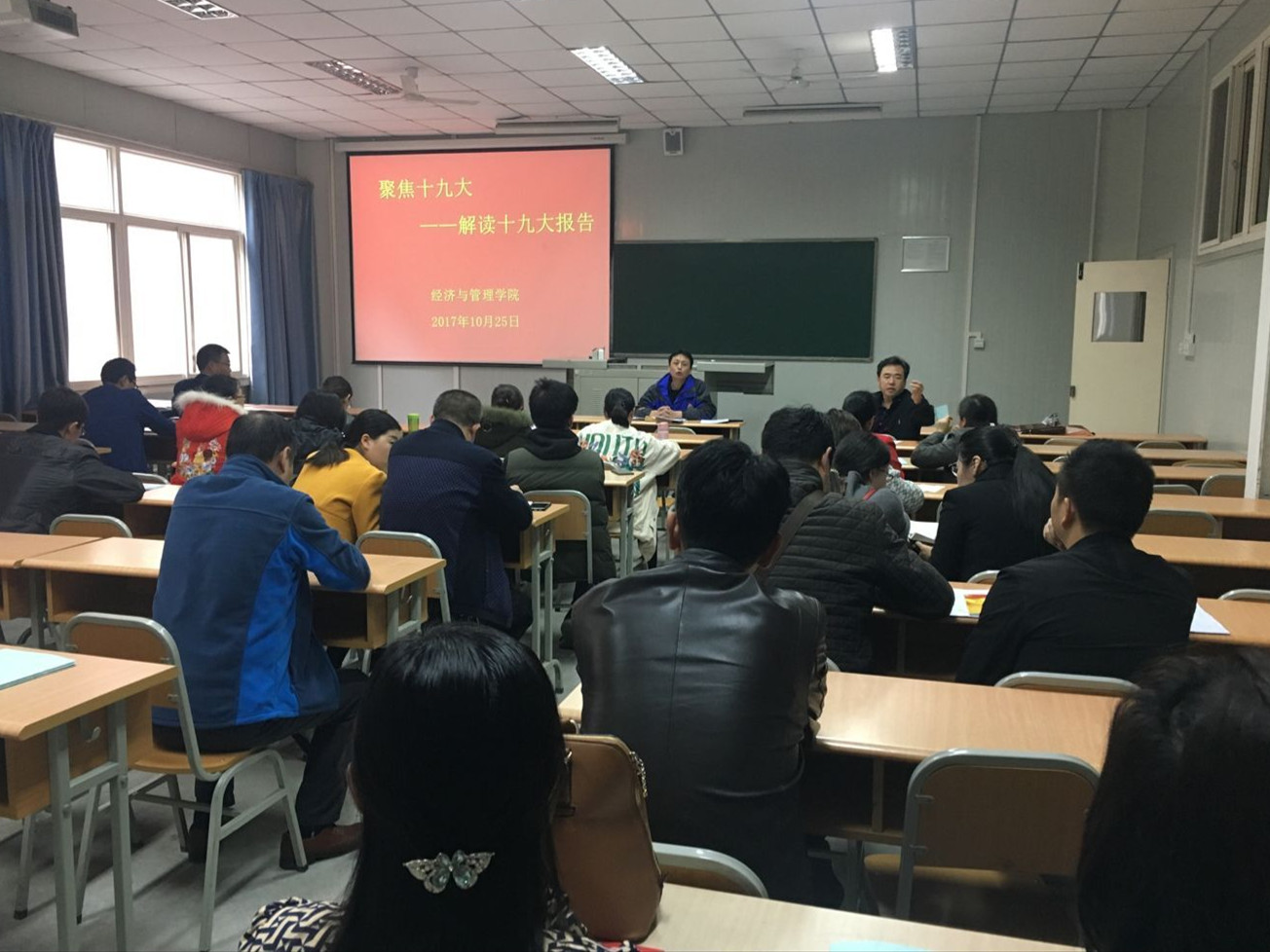 ——经管学院。10月18日上午9时,经管学院组织召集无课师生在江北校区餐厅二楼集体收看了十九大开幕式盛况。收看结束后,师生纷纷表示,习近平总书记的报告思想丰富深邃、内涵博大精深,规划了未来的愿景,描绘了未来的蓝图,令人振奋和鼓舞。我们将把思想和行动统一到十九大精神上来,在具体工作、学习中不忘初心,牢记使命,砥砺前行。10月25日下午,学院党总支在江南校区1021教室召开“聚焦十九大——解读十九大报告”专题学习会议。会议由党总支书记郑武生主持。会上,郑武生讲道,习近平总书记所作的报告气势恢宏、继往开来,是马克思主义的纲领性文献,是我们党面向未来的伟大政治宣言;报告坚持以人民为中心的发展思想,言简意赅,都是关系党和国家前途命运的关键话、都是指导工作实践的管用话、都是接地气听得懂的大实话,饱含深意,极具感染力和震撼力;报告描绘了中国未来的宏伟蓝图,使我们看到了中国未来的愿景,令人振奋、备受鼓舞。学习宣传贯彻十九大精神是当前和今后一个时期的首要政治任务,我们要在全院掀起学习宣传的热潮,把思想和行动统一到十九大精神上来。郑武生对学院今后一段时期深入学习宣传贯彻党的十九大精神进行了安排。一是中心组、党总支、党支部、团总支要带头先学,并要迅速组织支部党员、团员青年、师生员工认真学习和深入领会十九大精神实质;二是11月上旬召开中心组学习十九大精神心得体会交流会,11月30日以前,全体党员每人提交一篇1000字以上的心得体会文章;三是将学习十九大精神与提升教育教学质量、人才培养质量紧密结合,与推进学院各项工作紧密结合,与实现yl23455十三五两大战略任务(转型发展、提升层次)紧密结合,自觉用党的理论创新成果武装头脑、指导实践、推动工作,不断谱写yl23455各项事业新篇章。10月26日中午,经管学院学生第一党支部书记石晓琳在江北校区1423教室为本支部全体学生党员讲授了“不忘初心,牢记使命”学习党的十九大精神专题党课。石晓琳讲道,十九大报告紧紧围绕中华民族伟大复兴的中国梦这个宏伟目标,顺应时代潮流,回应人民向往,发出了新时代的政治宣言。作为马克思主义中国化最新成果,习近平新时代中国特色社会主义思想是实现社会主义现代化和中华民族伟大复兴中国梦的行动指南。她激励学生党员:第二个百年的奋斗目标需要你们去实现,作为新时代青年学子中的先进代表,一定要不忘初心,牢记使命,努力学习,练就本领,使自己成为德智体美全面发展的社会主义事业合格建设者和可靠接班人,中华民族伟大复兴的中国梦终将在一代代青年的接力奋斗中变为现实,希望大家在实现中华民族伟大复兴历程中建功立业,担负当代青年人的重大历史使命。党课结束后,举行了新党员入党宣誓仪式。11月1日中午,学院团总支在江北校区1421教室召开十九大精神学习会,团总支委员、各班团支部书记参加学习。会议由团总支书记段雪丰主持,郑武生参加学习并对团总支、团支部下一步的深入学习宣传贯彻十九大精神提出要求。 下午,党总支中心组在党员活动室召开了学习十九大精神心得体会交流会。与会的每位同志结合自己的学习情况和实际工作,分享了学习收获,交流了学习体会,表示要继续深入学习领悟十九大精神,把思想和行动统一到十九大精神上来,自觉用党的理论创新成果武装头脑、指导实际工作。