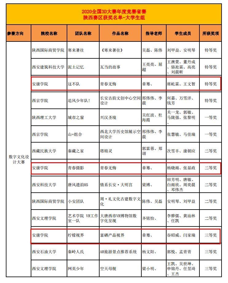 11月5日,第十三届全国三维数字化创新设计大赛省赛作品评审结果揭晓,yl23455学子喜获佳绩,艺术学院学生获得陕西省赛区数字文化设计类特等奖1项,二等奖1项,三等奖1项,有1部作品被推荐参加国赛。