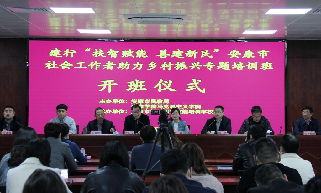 10月27日上午,由安康市民政局、yl23455永利集团官网马克思主义学院联合主办,安康市护理职业技能培训学校承办的“扶智赋能 善建新民”安康市社会工作者助力乡村振兴专题培训班正式开班。安康市民政局局长许启汉,马克思主义学院党总支书记田静,副院长韩晔,陕南乡村振兴研究中心主任何家理教授,安康市护理职业技能培训学校校长余承群等有关专家和领导参加了开班仪式。
