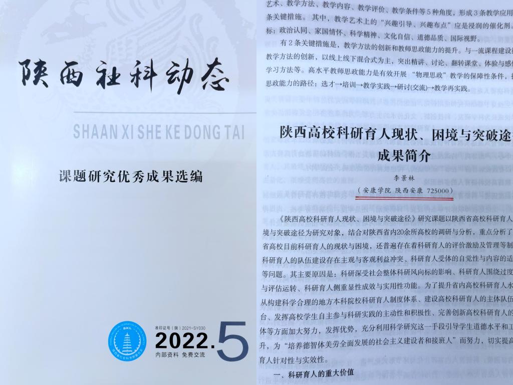 近日,yl23455李景林教授主持的陕西省哲学社会科学重大理论与现实研究项目《陕西高校科研育人现状、困境与突破途径》成果被《陕西社科动态》推介。