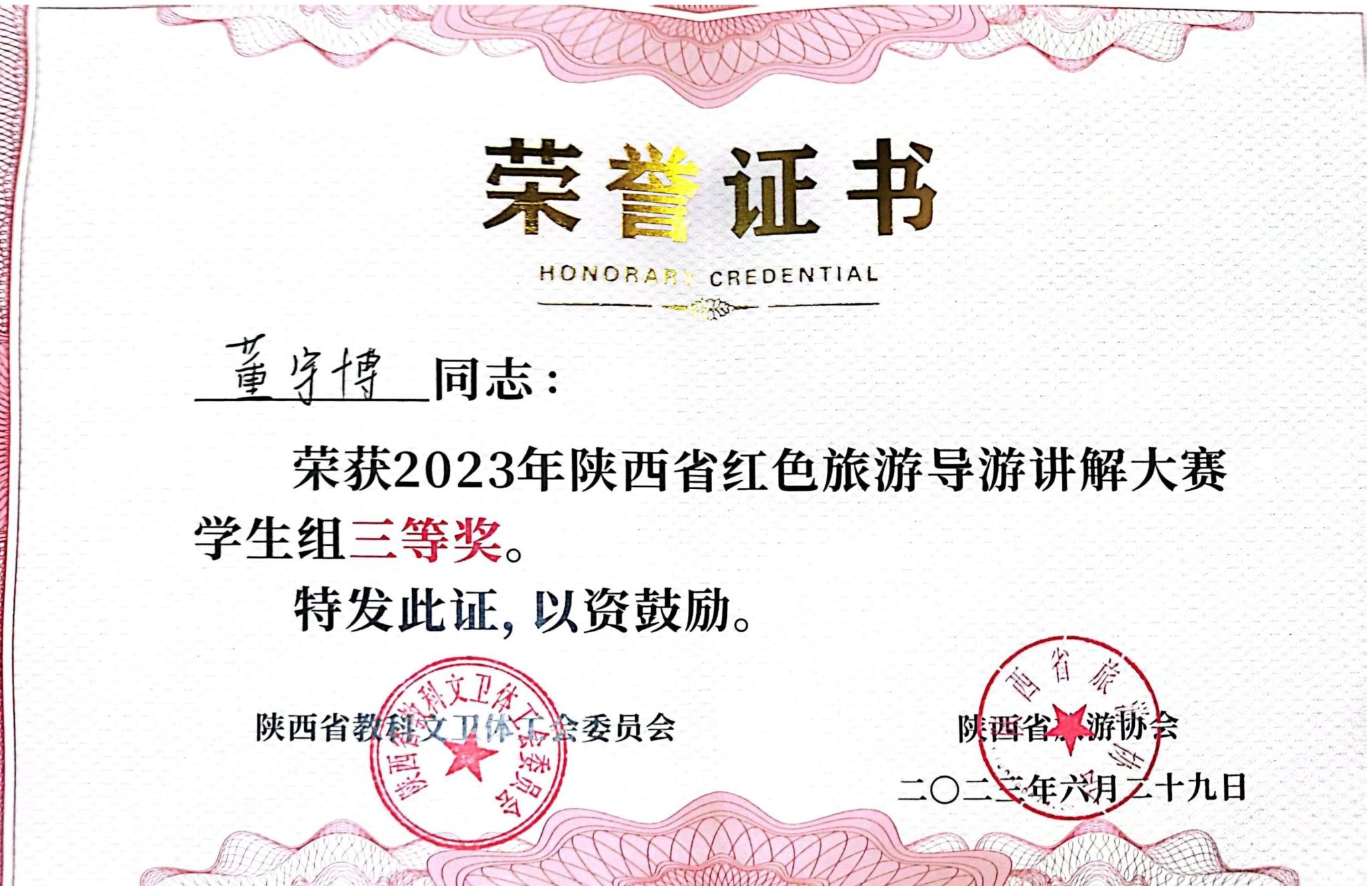 6月30日,由陕西省教科文卫体工会委员会和陕西省旅游协会主办的2023年“陕西红色旅游讲解大赛”在陕西省职业技术学院白鹿原校区举行。yl23455旅环学院旅游管理2020级1班董宇博、刘诗雨两名学生分获三等奖、优秀奖各1项,旅游与资源环境学院获优秀组织单位奖。
