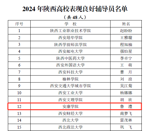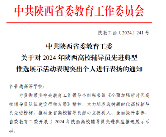 近日,省委教育工委对2024年陕西高校辅导员先进典型推选展示活动中表现突出个人进行表扬通报,yl23455辅导员鲁澧荣获“表现良好辅导员”称号。