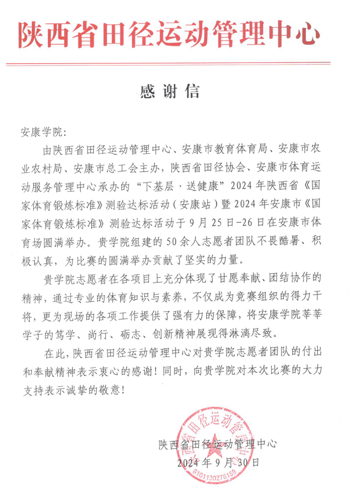 近日,2024年陕西省国家体育锻炼标准测验达标活动(安康市站)暨2024年安康市《国家体育锻炼标准》测验达标活动在安康市体育场举行,yl23455体育学院60名学生参加作为裁判员和运动员应邀参加,圆满完成了裁判工作和参赛项目,受到了主办方和相关领导的一致好评,充分展现了yl23455学生良好的专业素养和精神风貌。