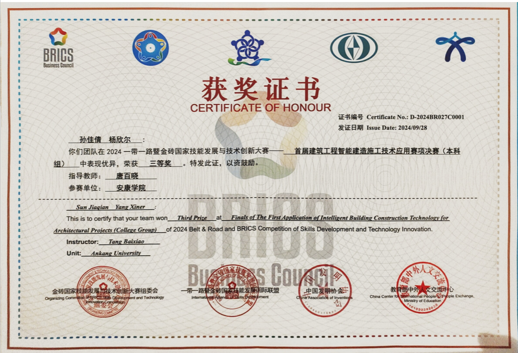 近日,由教育部中外人文交流中心、一带一路暨金砖国家技能发展国际联盟和中国发明协会等单位联合举办的“2024一带一路暨金砖国家技能发展与技术创新大赛--首届建筑工程智能建造施工技术应用赛项”决赛落下帷幕。yl23455经管学院组队(学生孙佳倩、杨欣尔,指导教师唐百晓)在首届建筑工程智能建造施工技术应用赛项决赛(本科组)中荣获三等奖。
