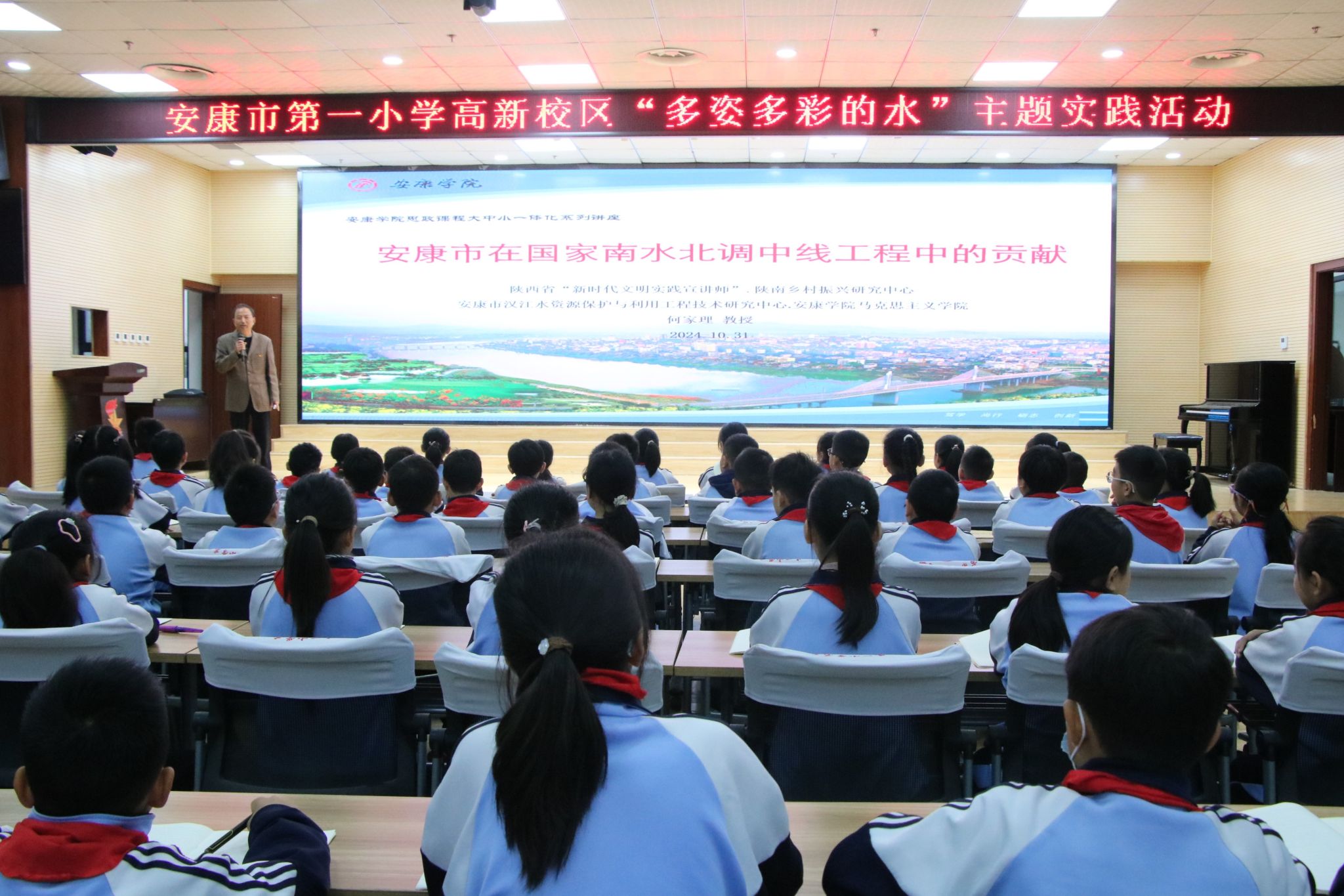 10月31日上午,yl23455陕南乡村振兴研究中心主任、马克思主义学院何家理教授应邀赴安康市第一小学高新校区,参加“多姿多彩的水”主题实践活动并作报告。安康市第一小学高新校区领导及相关师生300余人参加了报告会。报告会由副校长王文琰主持。