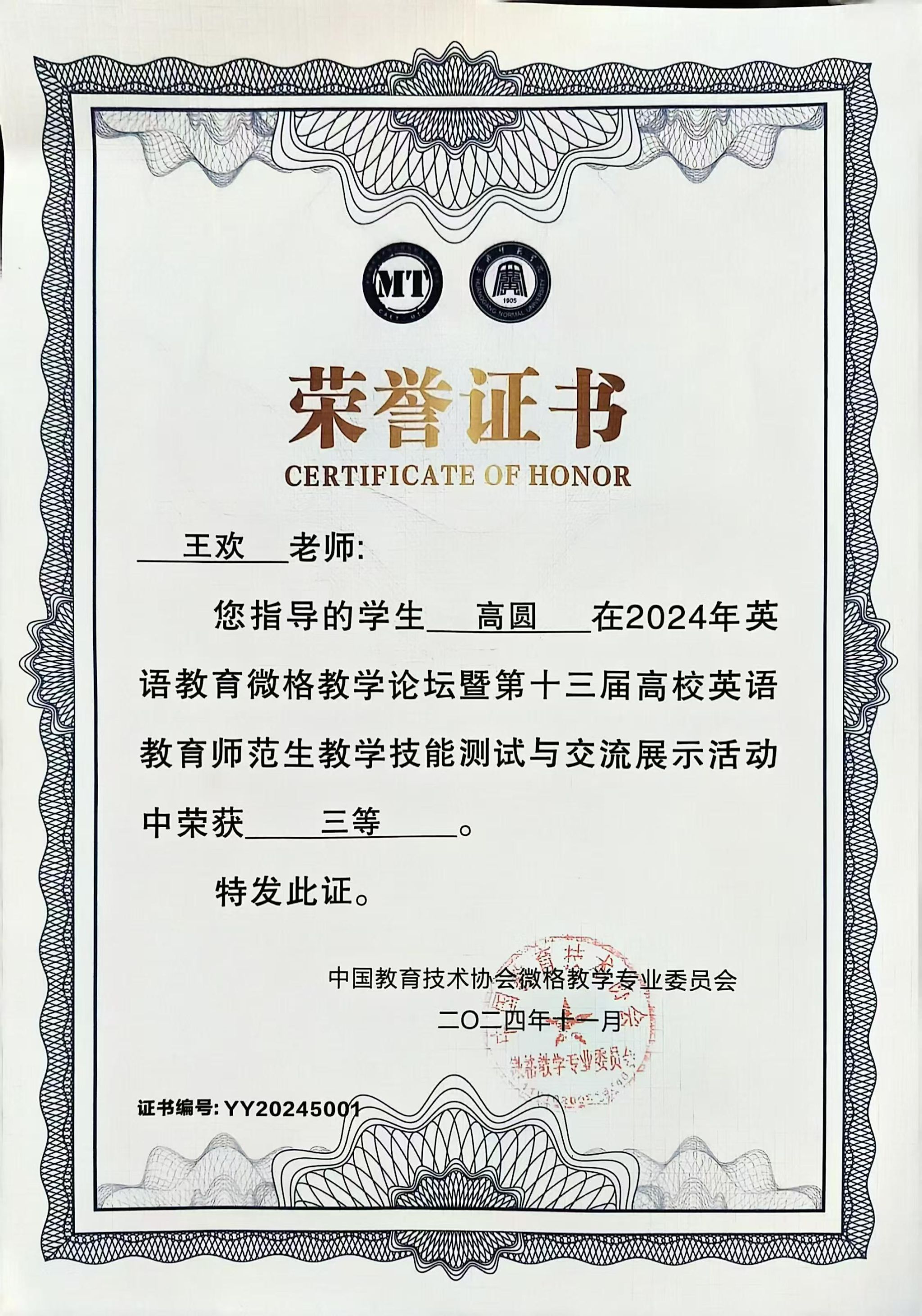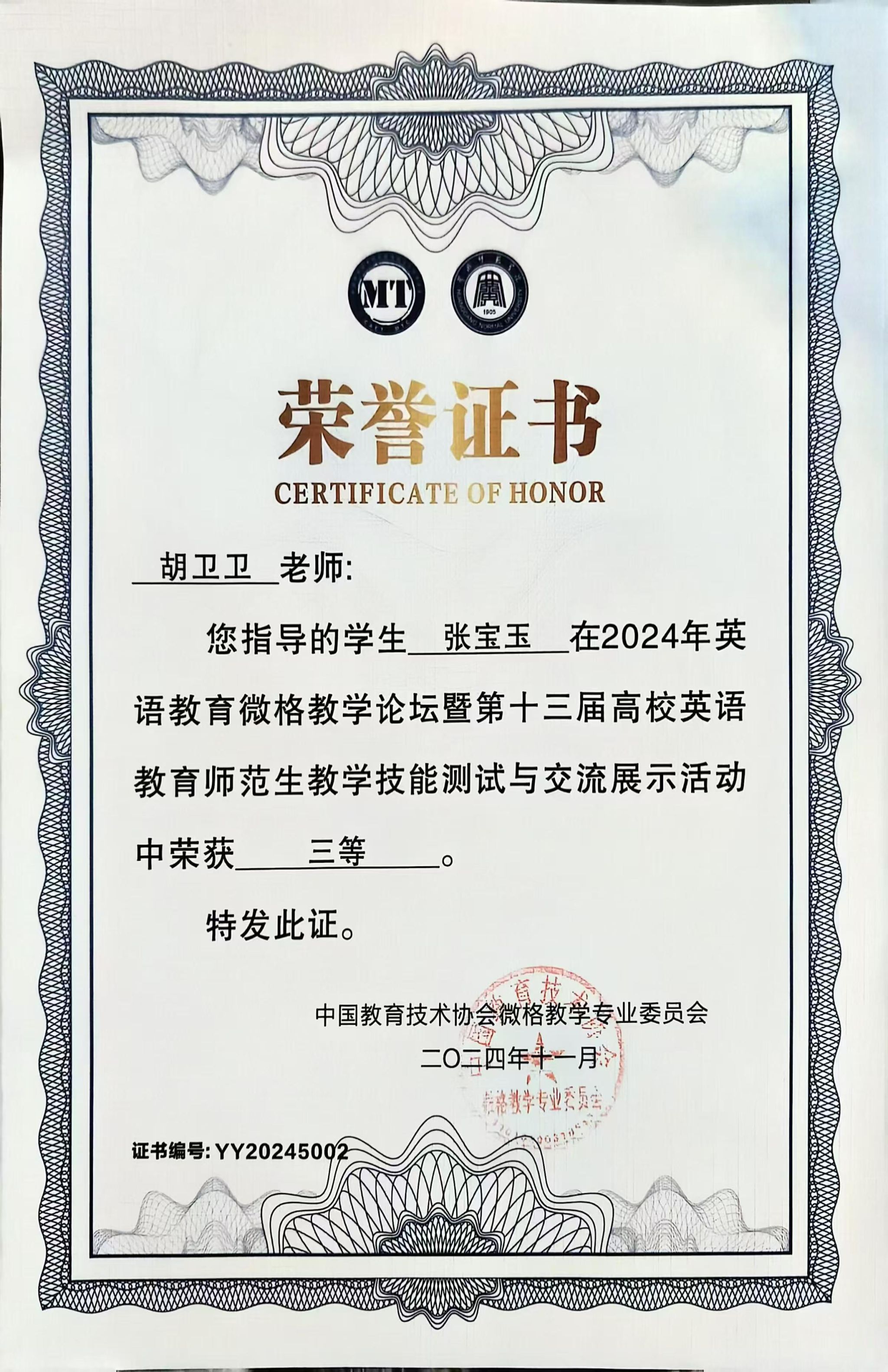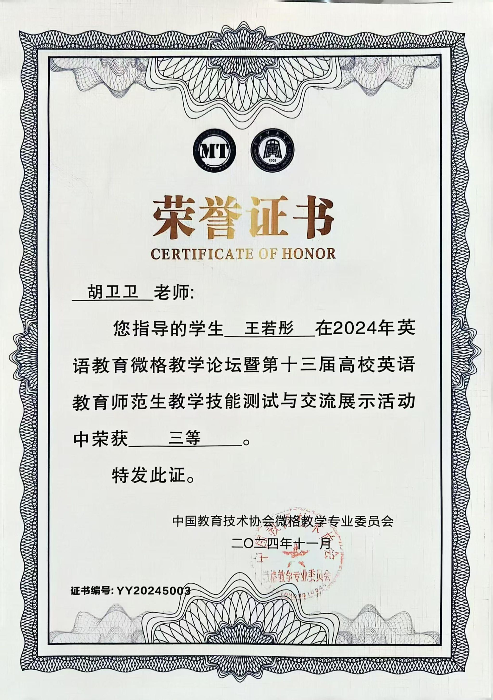 近日,2024年英语教育微格教学论坛暨第十三届高校英语教育师范生教学技能测试与交流展示活动在黄冈师范学院成功举行。yl23455外语学院英语专业学生王若彤、张宝玉和高圆经过教学设计评比、现场说课、模拟授课、现场答辩等环节的激烈比拼,获得本科组三等奖。