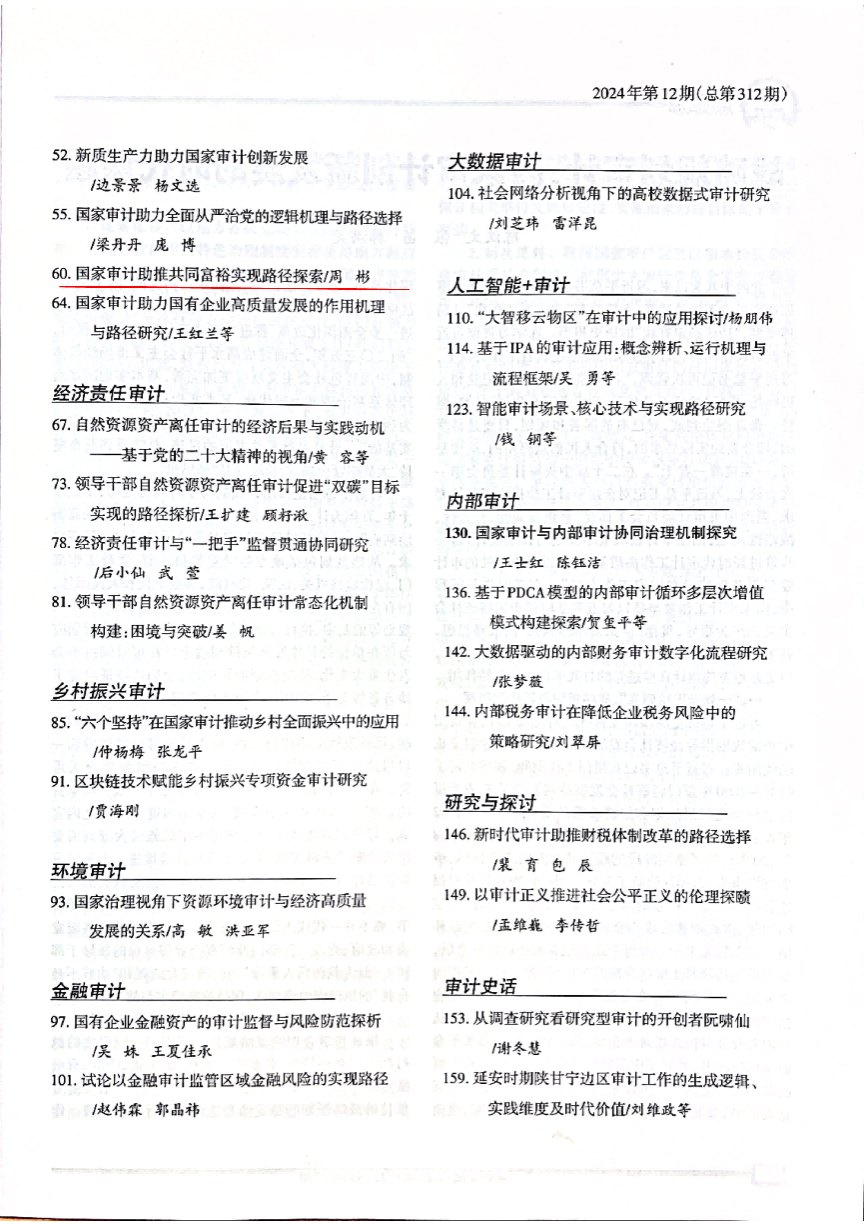 近日,从中国人民大学复印报刊资料数据库获悉,yl23455学报2024年第4期刊发的论文《国家审计助推共同富裕实现路径探索》被人大复印报刊资料《审计文摘》2024年第12期全文转载。