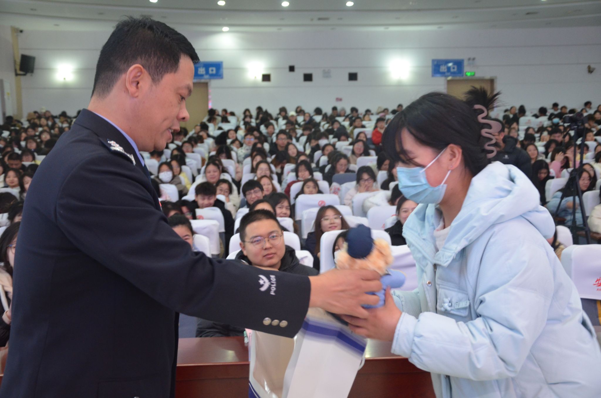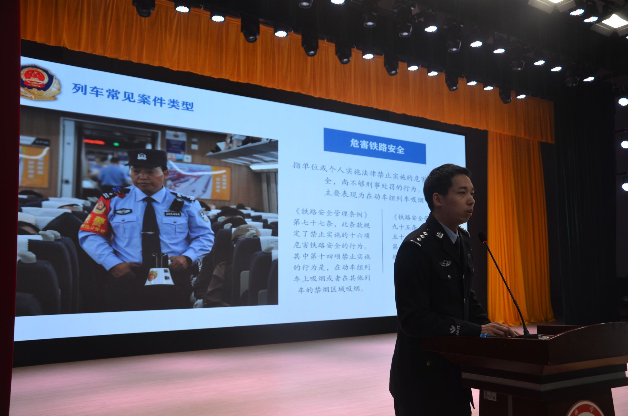董杰松在讲话中指出,安全无小事,大家都应该对自己和家人负责,希望师生增强安全乘车及防盗、防骗意识,提高自我保护能力。乘警支队民警王宇栋从列车上违法犯罪行为案件类型、乘坐安全提示、进站乘车注意事项、防范电信网络诈骗等几个方面进行讲解,并利用警示视频和现场提问等形式向师生分享了铁路乘车安全及法治安全知识。