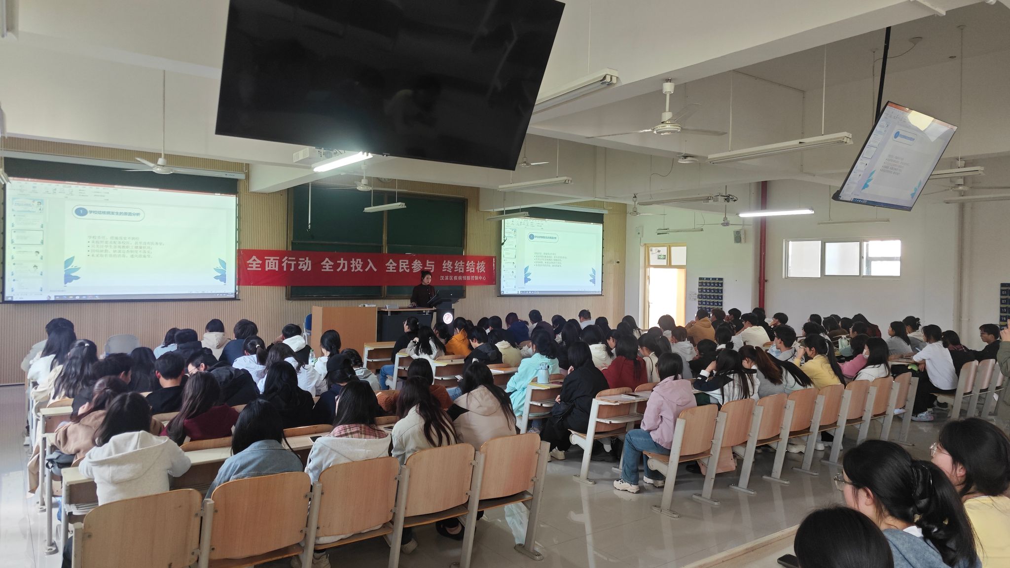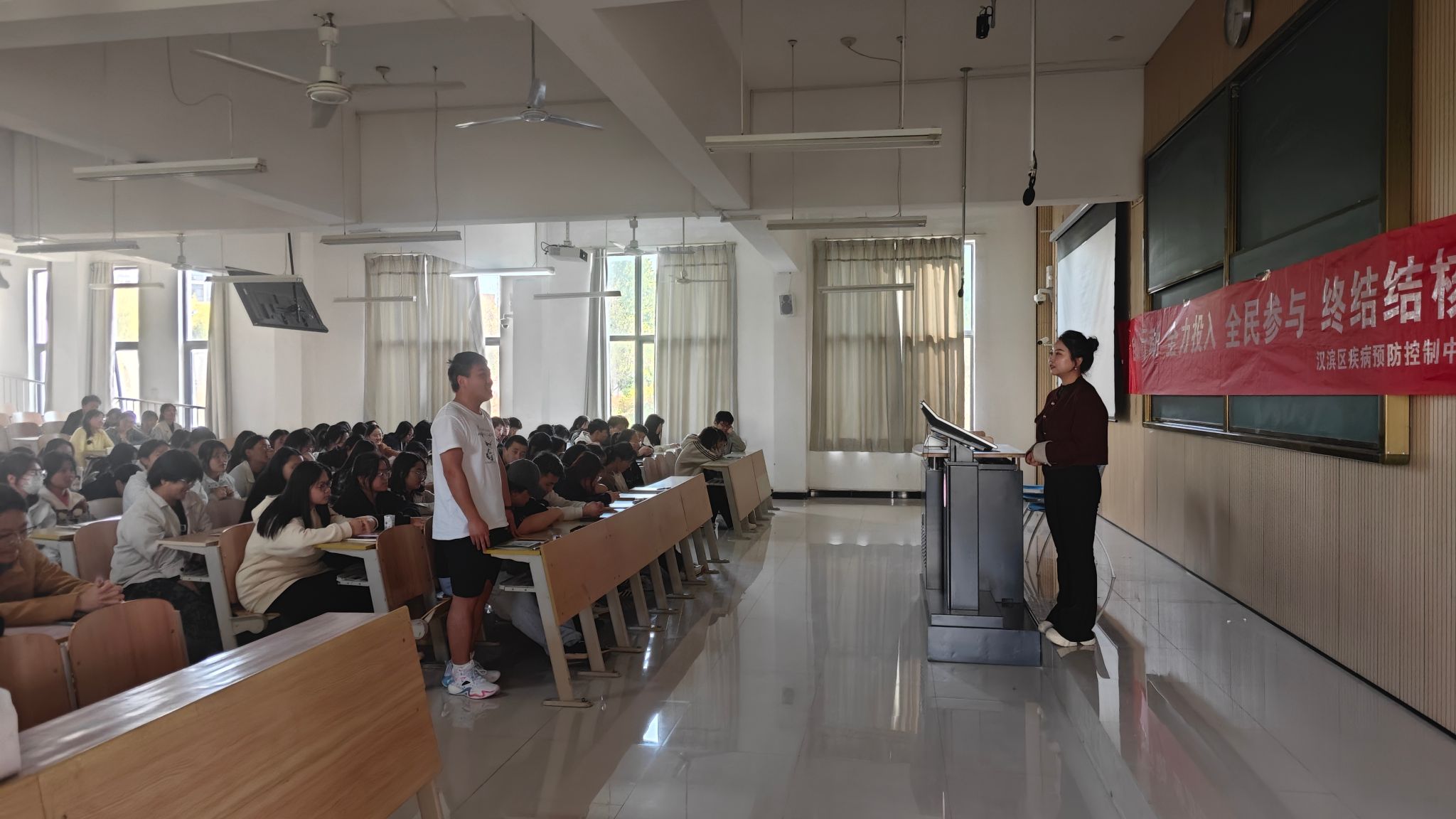 下午,汉滨区疾病预防控制中心结核病防治科科长胡天怡应邀为yl23455200余名师生作专题报告。胡天怡结合高校特点,系统讲授校园结核病防控要点。在互动环节,同学们积极响应,踊跃参与。