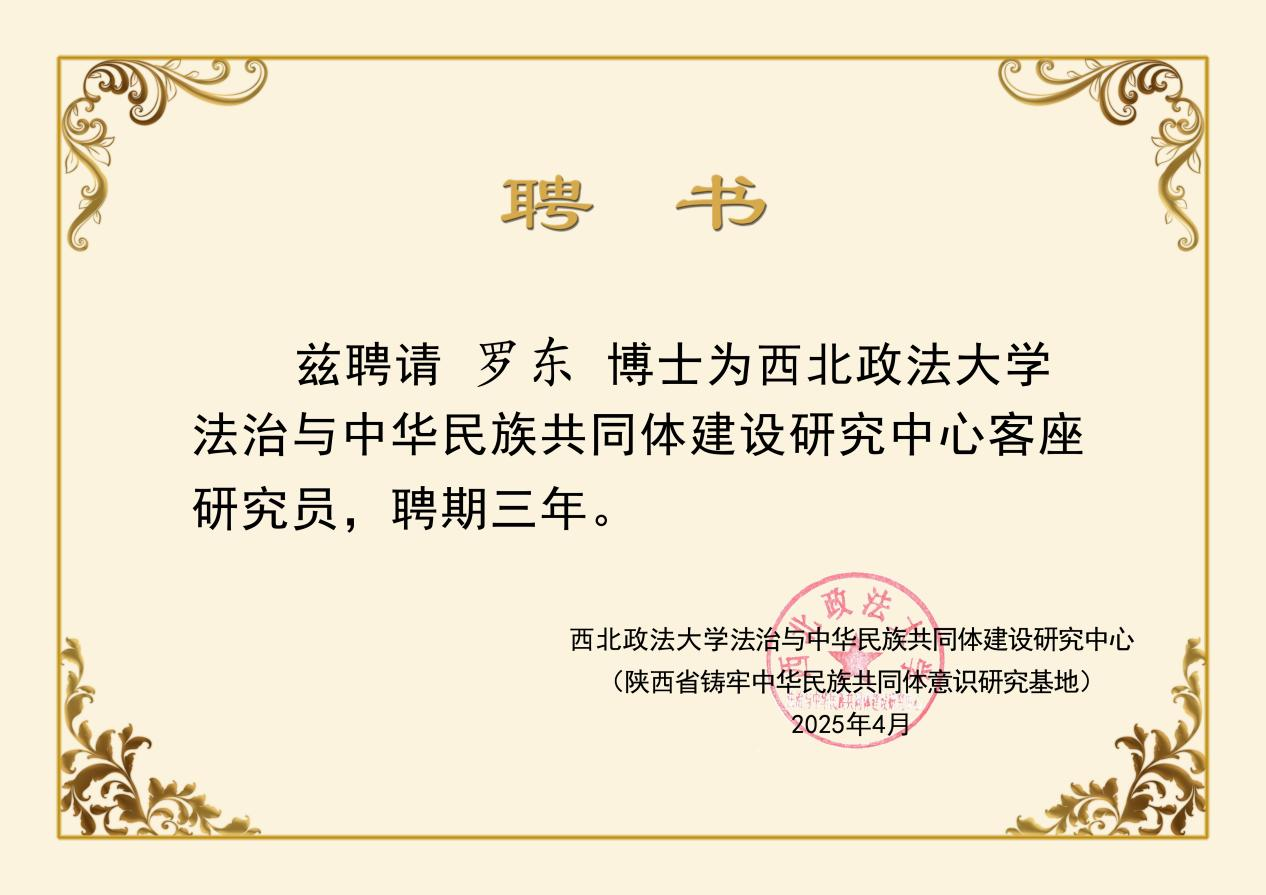 近日,yl23455马克思主义学院青年教师罗东博士受聘为西北政法大学法治与中华民族共同体建设研究中心客座研究员。