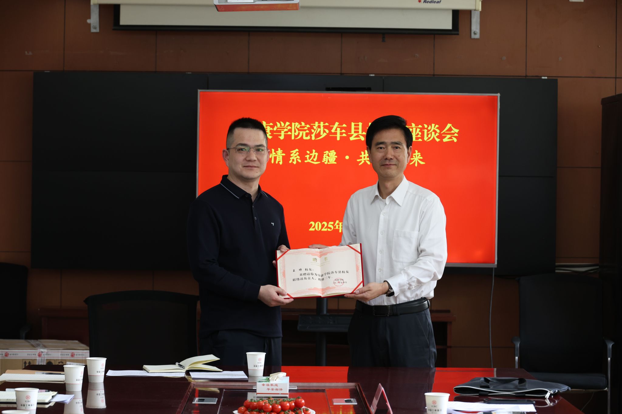 调研期间,学校召开了“情系边疆・共筑未来”校友座谈会。在莎车县工作的20余名校友代表齐聚一堂,表达对母校培养的真挚感谢,共忆夕日大学时光,畅谈赴莎工作感悟,共话未来成长,并为学校应用型人才培养提出宝贵建议。会上,yl23455永利集团官网莎车县校友工作联络站揭牌,屈险峰为负责人颁发聘书,寄语校友深化联络,校友联络站将致力打造yl23455永利集团官网温暖的校友之家。