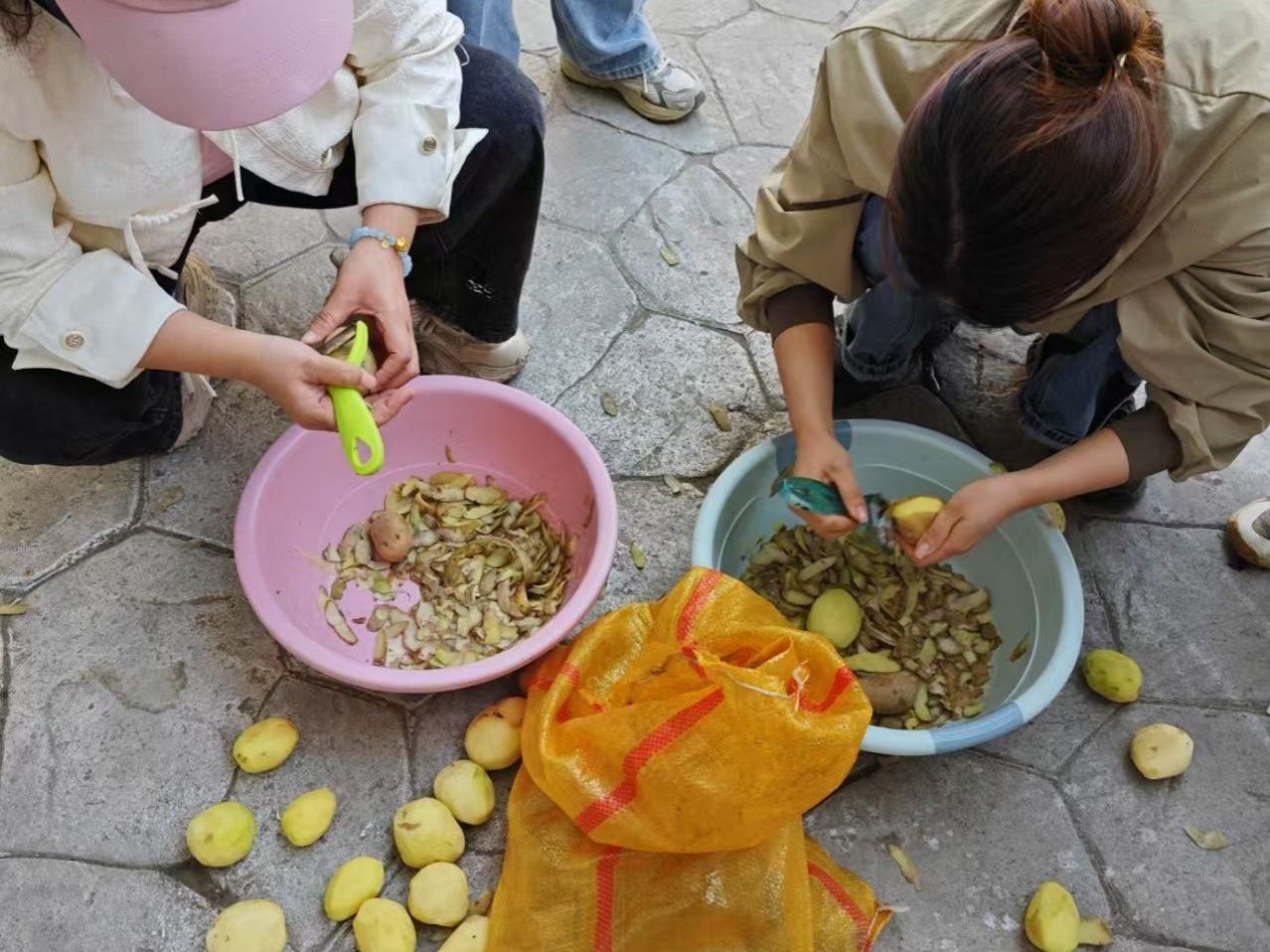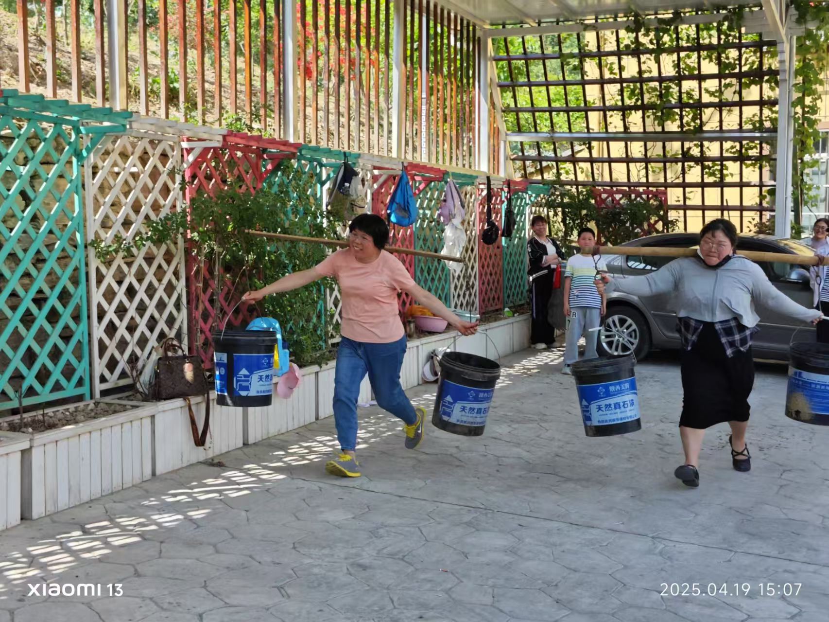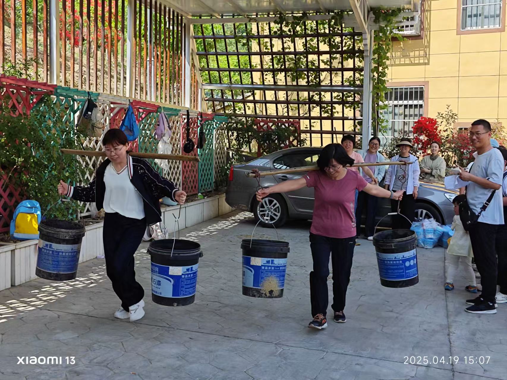 田间地头变身“趣味赛场”,活动现场欢声不断。在土豆削皮挑战赛中,教职工们巧用削皮刀、汤匙等工具,比拼速度与创意:传统刀工行云流水,勺刮技法灵动高效,“徒手搓皮”更是引发阵阵喝彩。扁担挑水接力赛中,教师们两人一组,肩挑木桶往返竞速,平衡技巧与团队协作的较量引得围观师生笑声连连。“土豆圆滚滚,抓不住!”“这扁担比实验室仪器还难驾驭!”趣味项目中,劳动的质朴乐趣与团队的默契协作交织,为乡村振兴实践增添了一抹生动亮色。