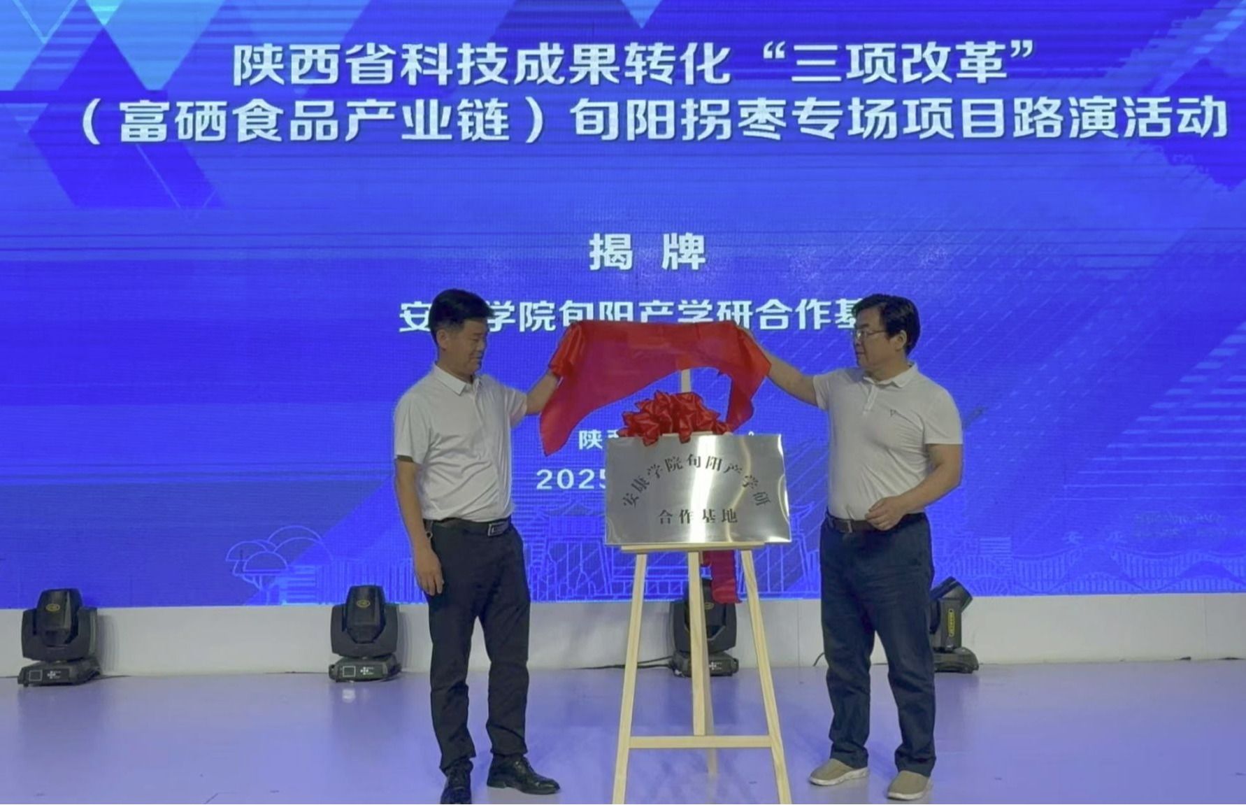 在与会嘉宾的共同见证下,王健代表学校与旬阳市政府副市长沈纪兵共同为“yl23455永利集团官网 旬阳产学研合作基地”揭牌,标志着yl23455与旬阳市的校地合作迈入了全新阶段。该基地将围绕拐枣功能食品开发展开深度科研攻关,充分挖掘拐枣产业巨大潜力,通过提升产品附加值,推动科技成果转化落地,为当地产业升级持续注入强劲动力。