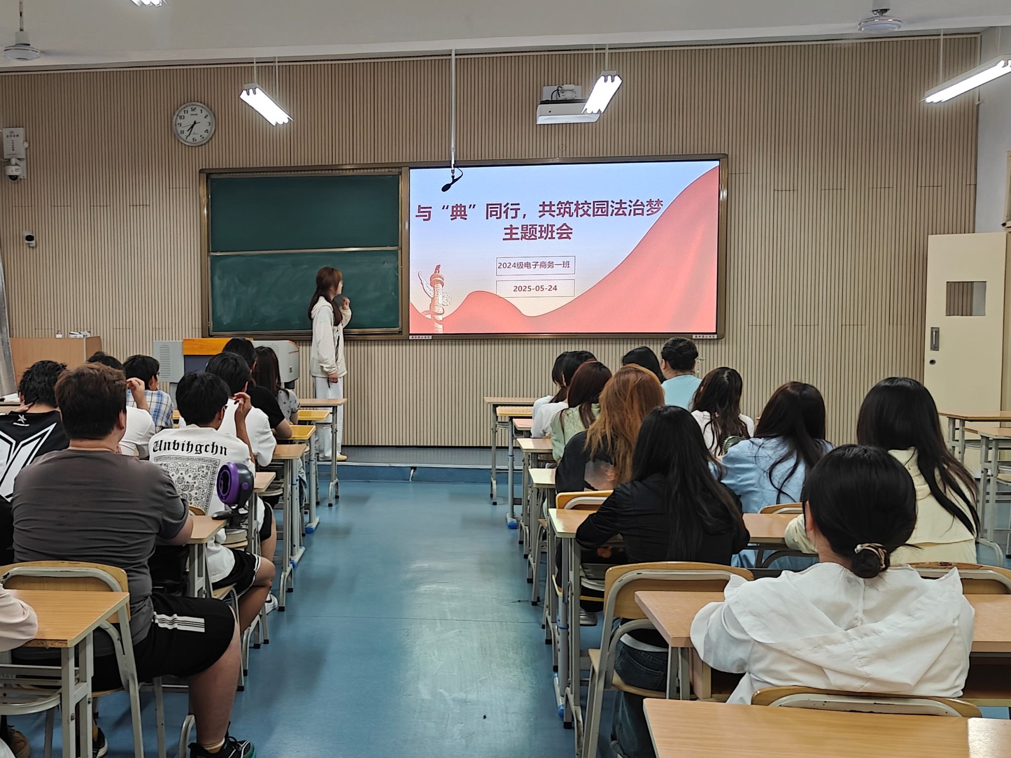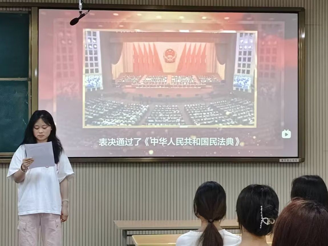 学院在21个班级中广泛开展了以“与‘典’同行,共筑校园法治”为主题的班会活动。各班结合实际,精心设计活动形式,确保班会取得实效。有的班级借助精心制作的PPT,结合生活中鲜活的案例,用通俗语言宣讲法治知识;有的班级组织法律知识问答,通过趣味互动强化了同学们对民法典知识的记忆和理解;有的班级通过模拟法庭辩论,引导同学们深入探讨校园生活与法律法规的紧密联系。班会结束后,学生们纷纷表示:“法律不是冰冷的条文,而是保护我们成长的铠甲。”