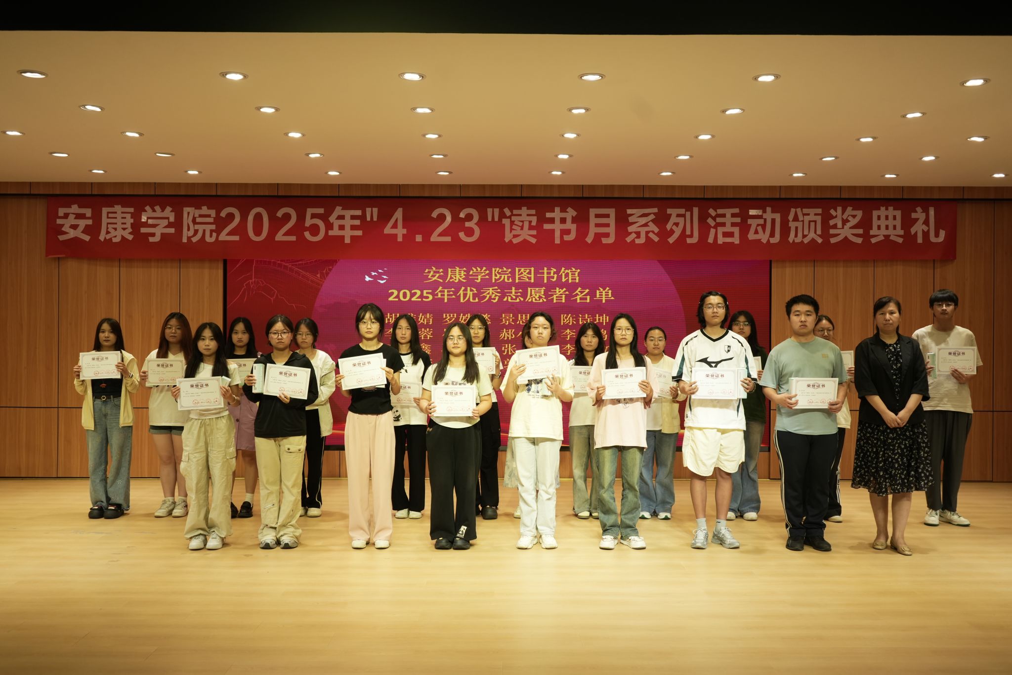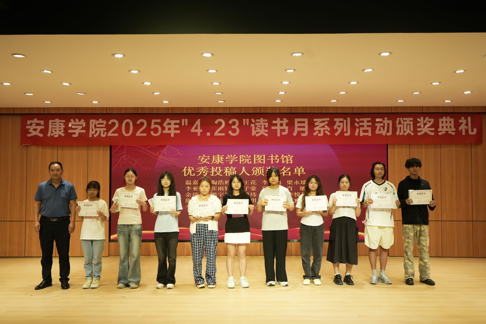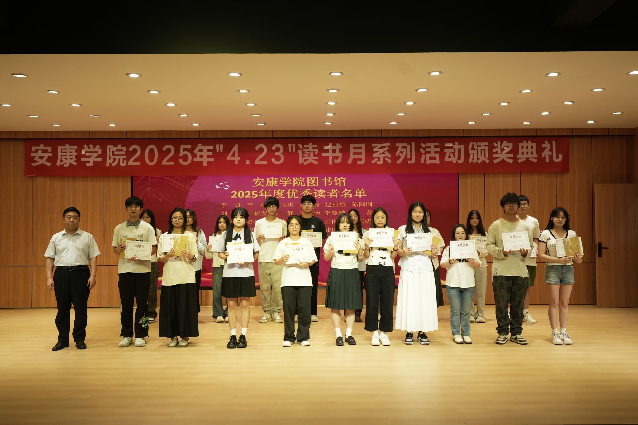 活动现场为“阅读马拉松”“优秀投稿人”“优秀志愿者”“年风年俗年味”视频征集大赛、“书海寻宝”、2025年高校信息检索大赛及“优秀读者”等获奖者颁发证书及奖品,肯定其在活动中的积极贡献。颁奖典礼穿插街舞、朗诵《书韵》《青春中国》、歌曲《心墙》《世界赠与我的》、古典舞《与君书》等节目,以青春洋溢的表演展现读者风采,为书香增添艺术韵律。