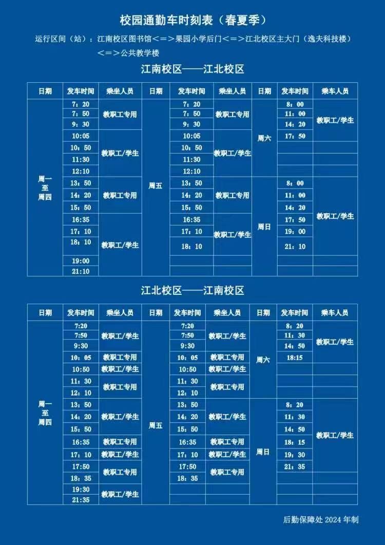 1.江南—江北校区 发车时间:7:50、11:30、14:20、17:50