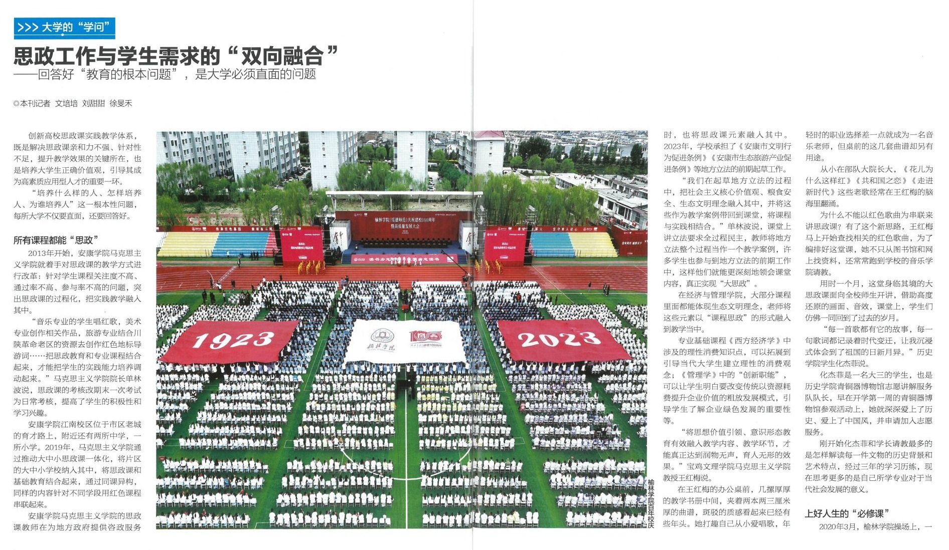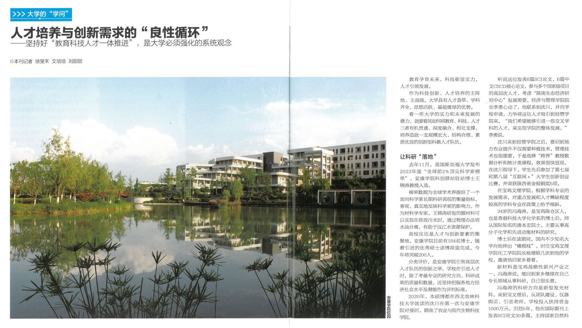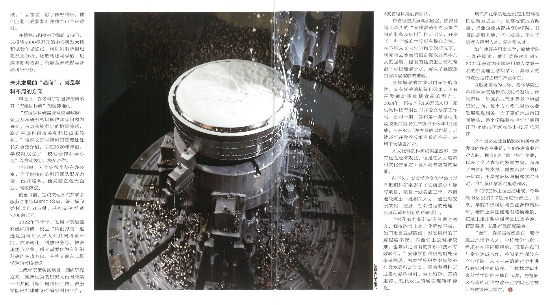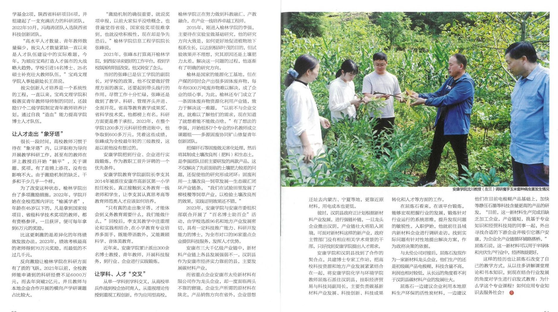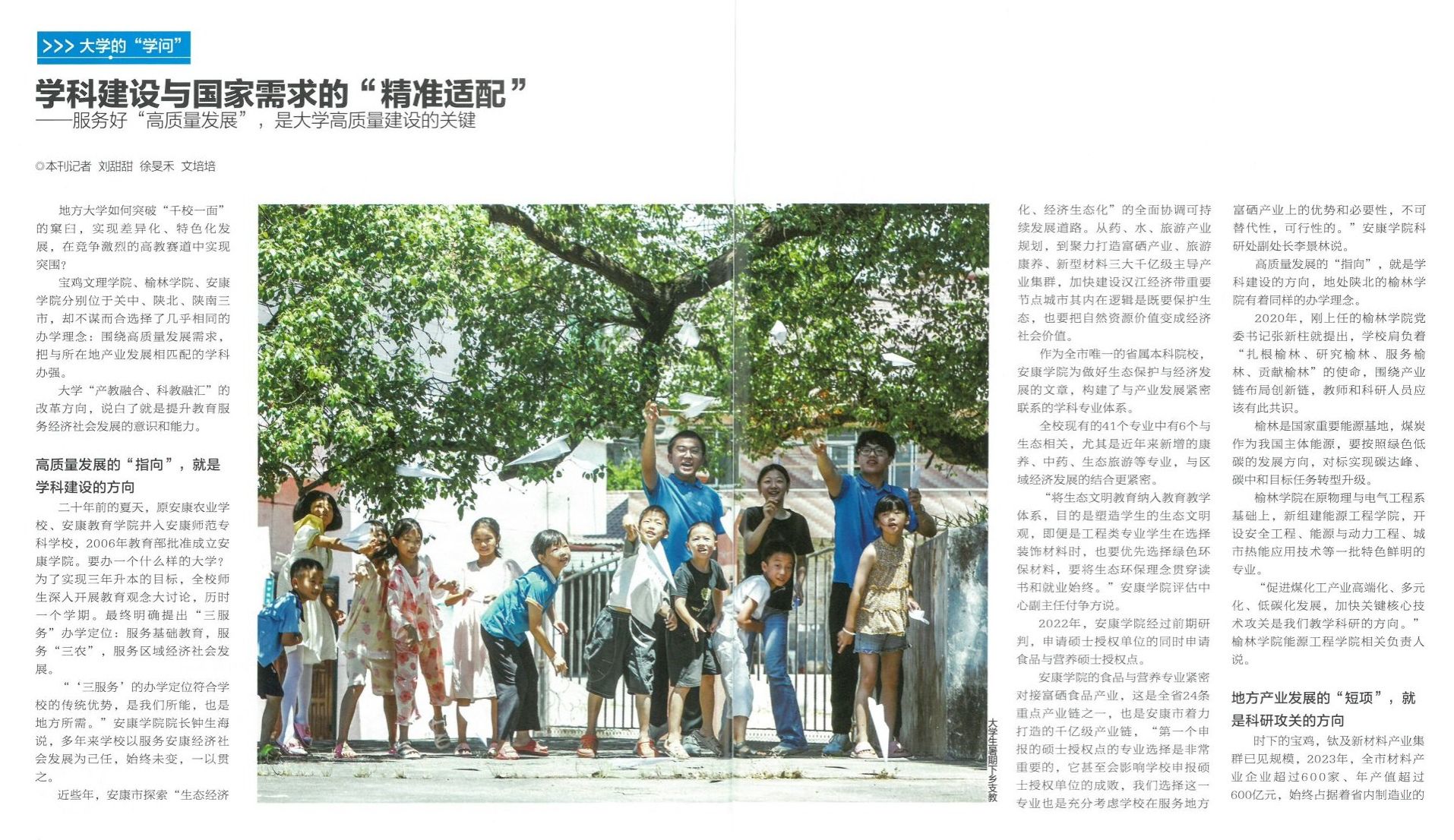 编者按:2024年8月,《当代陕西》杂志“大学的学问”专栏,独家报道yl23455永利集团官网等三所地方高校积极践行大学职能,发挥自身优势,推动教育、科技、人才一体发展,助力经济社会高质量发展的情况。其中,《学科建设与国家需求的“精准适配”》报道yl23455坚持“三服务”办学定位,积极探索构建与安康经济社会发展紧密结合的学科专业体系,加强有组织科研,提升服务社会能力的举措;《人才培养与创新需求的“良性循环”》报道yl23455持续优化高层次人才引育机制,探索实施分类评价,教师深入行业企业提升科研水平和实践能力的案例;《思政工作与学生需求“双向融合”》报道yl23455深化思政课教学改革,实施课程思政,推进大中小思政课一体化,落实立德树人根本任务的做法。