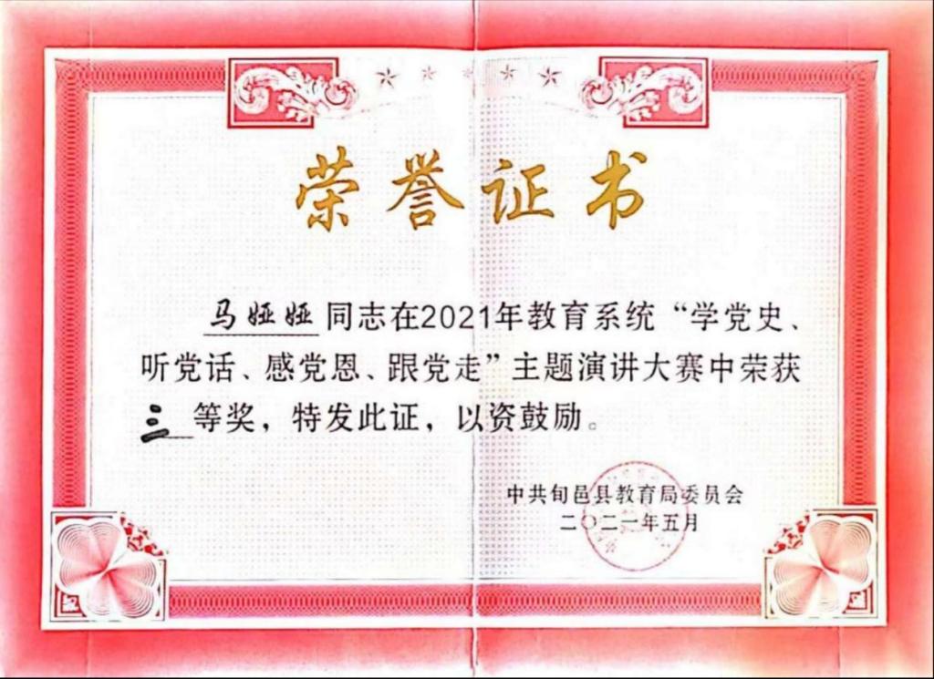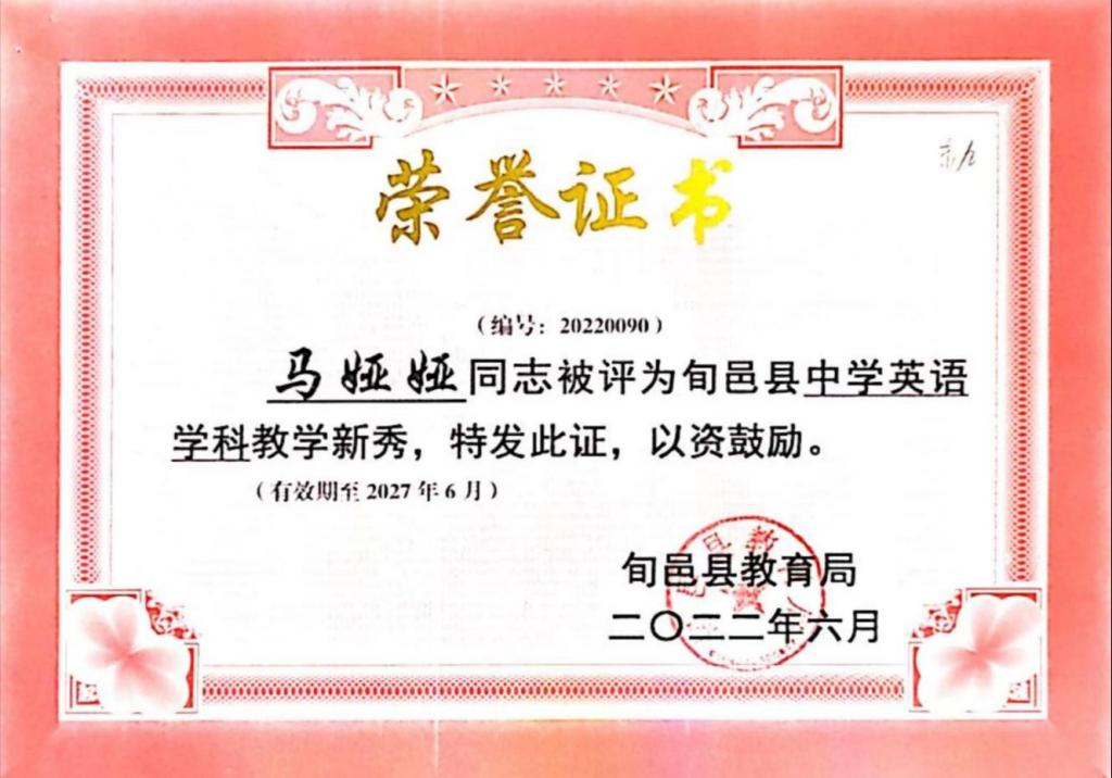 我热爱我的家乡,亦热爱乡村教育事业,而我热爱的也给予了我肯定。从教以来,我参与课题《如何在英语课堂教学中进行学困生转化》并获得市级立项;参与陕西省“奋斗陕西”奋斗人物录制活动;在旬邑县“青华杯”教学大赛中荣获“教学能手”称号;在旬邑县“2022年教学能手大赛”活动中荣获教坛新秀称号;在旬邑县“听党话,感党恩,跟党走”主题演讲大赛中荣获二等奖;在旬邑县“弘扬好家风,文明新时代”主题演讲中荣获三等奖;在旬邑县总工会“党在我心中,当好主人翁,争做新时代最美奋斗者”主题演讲赛中荣获三等奖;在旬邑县教育系统“学党史,听党话,感党恩,跟党走”主题演讲大赛中荣获三等奖;在太村镇赤道九年制寄宿学校“弘扬好家风,文明新时代”演讲比赛中荣获一等奖;在“弘扬爱国奋斗精神,建功立业新时代”师德师风演讲比赛一等奖;在旬邑县第六届“青少年经典诵读”大赛中荣获优秀指导教师称号;被评为太村镇赤道九年制寄宿学校2019—2020学年度教学能手;在太村镇赤道九年制寄宿学校微型课技能大赛中被评为优秀个人;在太村镇赤道九年制寄宿学校春季微型课活动中,荣获一等奖。